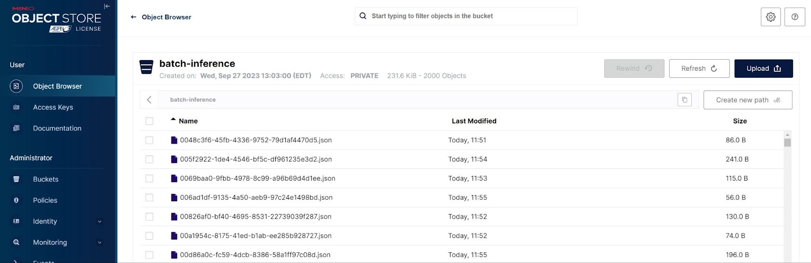As I stated previously, in the real world, data will not come packaged up nicely in CSV, JSON, and Parquet files. You will most likely be dealing with a lot of small objects where each object represents a single sample - or, in this case, a single tweak. We emulated this scenario earlier by creating a batch-inference bucket in MinIO. A screenshot is shown below.
