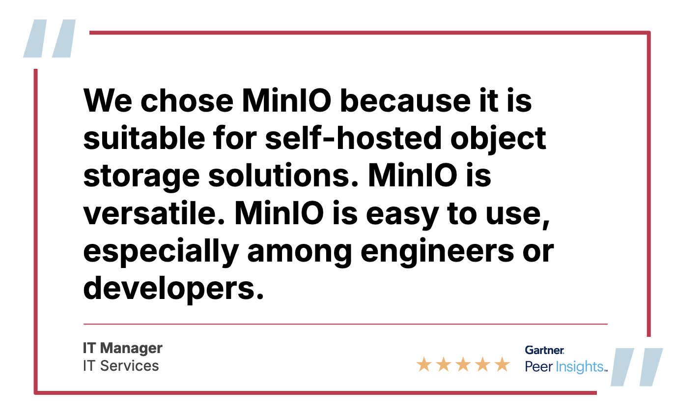 Here at MinIO we built our Object Store with simplicity and ease of install and usage not as an afterthought, but as the foundation. While we have every enterprise-grade feature imaginable (and some others), ultimately an application has to be used and maintained on a daily basis, so the easier it is to set up, use, maintain and automate - the more valuable it is to the organization.
