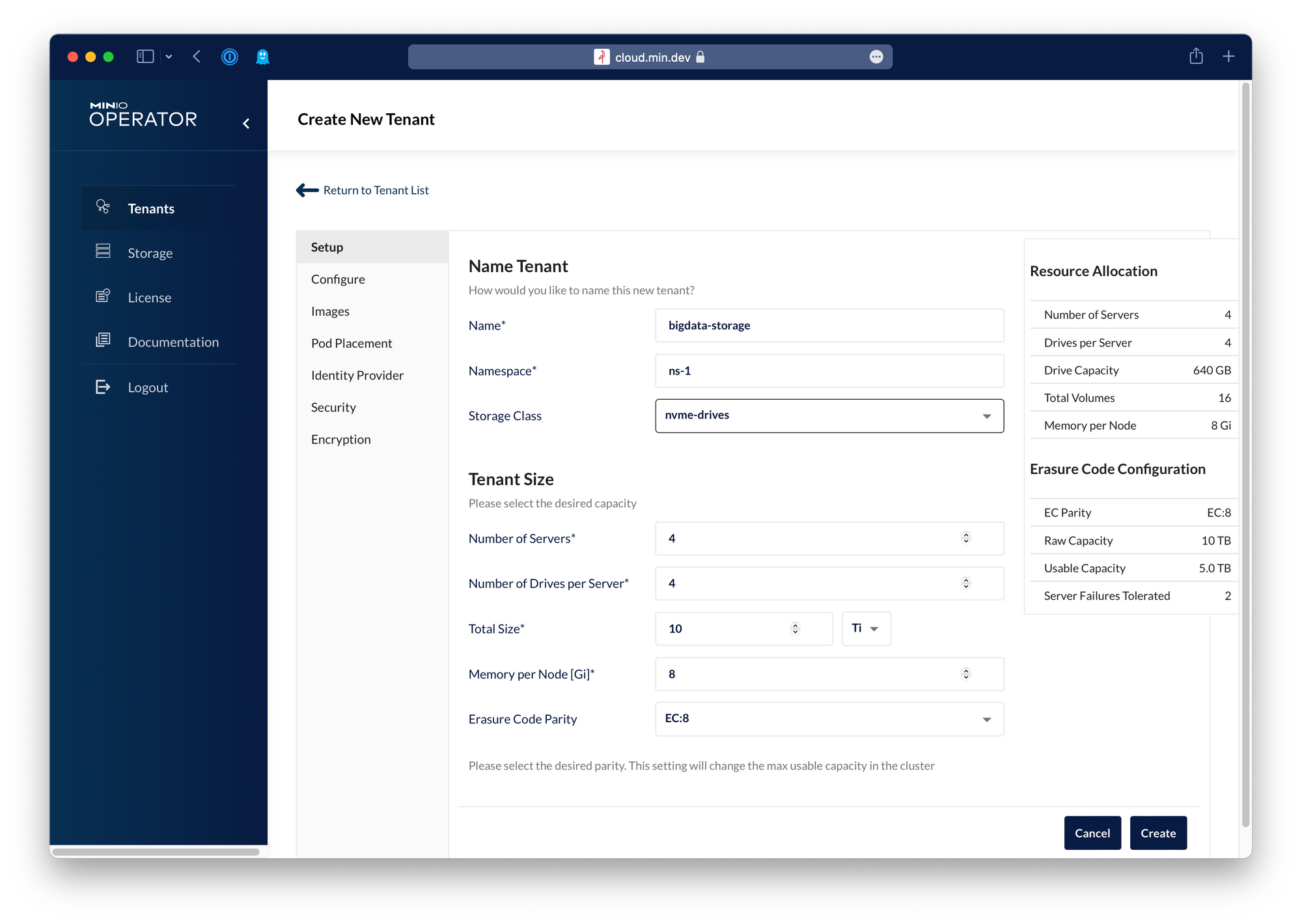Running MinIO on Kubernetes lets Kubernetes handle storage orchestration. MinIO Operator lets you hand off infrastructure tasks like provisioning, volume placement and storage allocation and let Kubernetes automatically take care of them. It could not be easier to create a tenant - name it, select a namespace and a storage class and let Kubernetes and MinIO spin it up for you. Take configuration deeper by toggling on Advanced Mode to assign Identity Provider, TLS Certificates, Encryption or specific resources for the tenant.