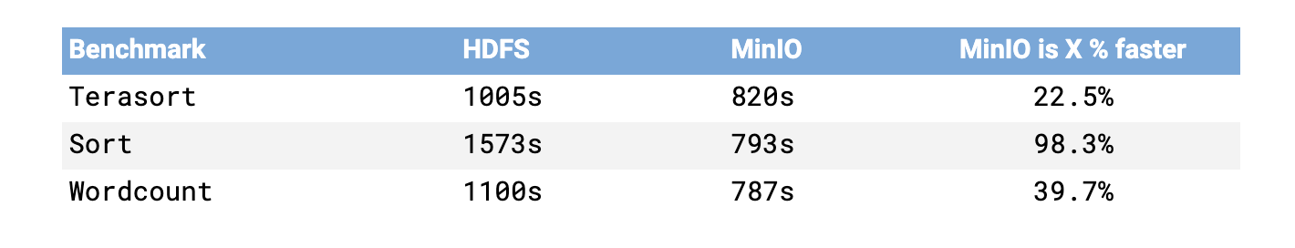 That is no longer true. Modern, cloud-native object storage has shattered the perception of what is possible on the performance front. This post demonstrates that by comparing the performance of Hadoop HDFS and MinIO using the most proven Hadoop benchmarks: Terasort, Sort and Wordcount. The results demonstrate that object storage is on par with HDFS in terms of performance - and makes a clear case for disaggregated Hadoop architecture.