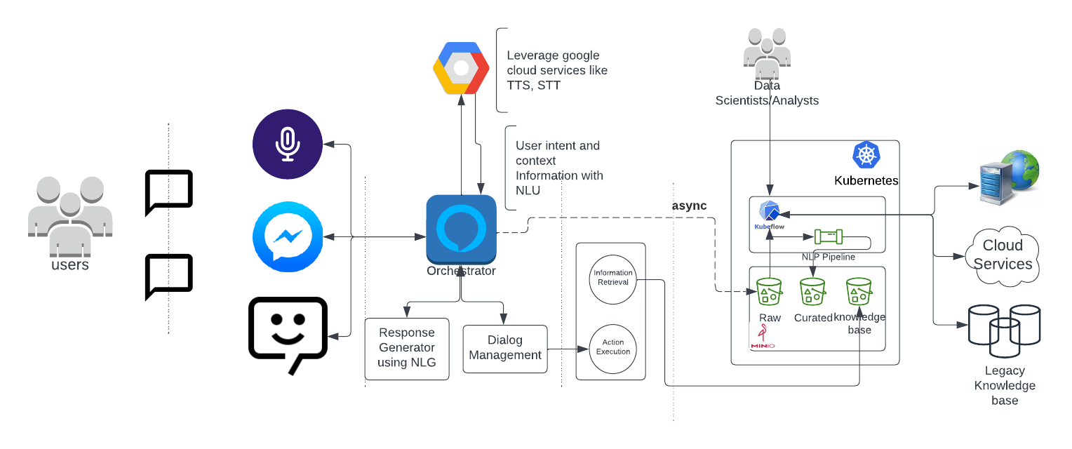 We are interested in the generative models for implementing a modern conversational AI chatbot. Let us look at the chatbot architecture in general and expand further to enable NLP to improve the knowledge base.