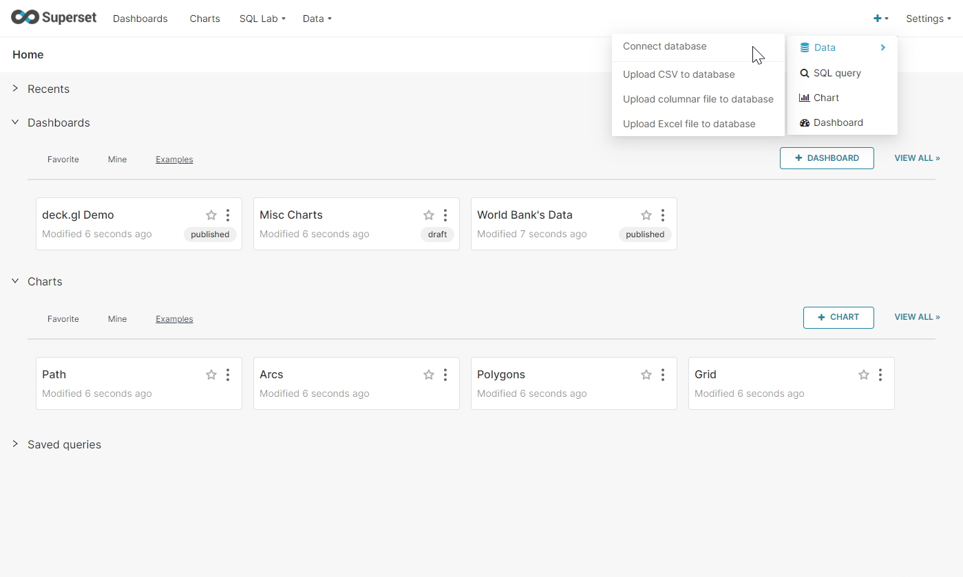 After logging in to Superset, you must connect it to Druid. On the top right, click the “+” to add a database.