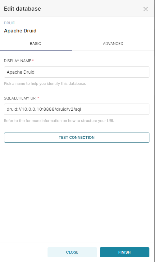 From the dropdown list select Apache Druid. Then name the connection and enter the following under SQLALCHEMY URI, making sure to update the IP address or replace it with localhost as necessary. If we had protected the Druid API by requiring authentication, we would also enter a username and password.