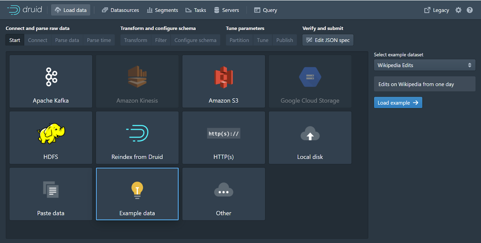At the top of the window, click Load Data. From here, select Example Data, then select Wikipedia Edits from the drop-down on the right and click the blue Load example button.