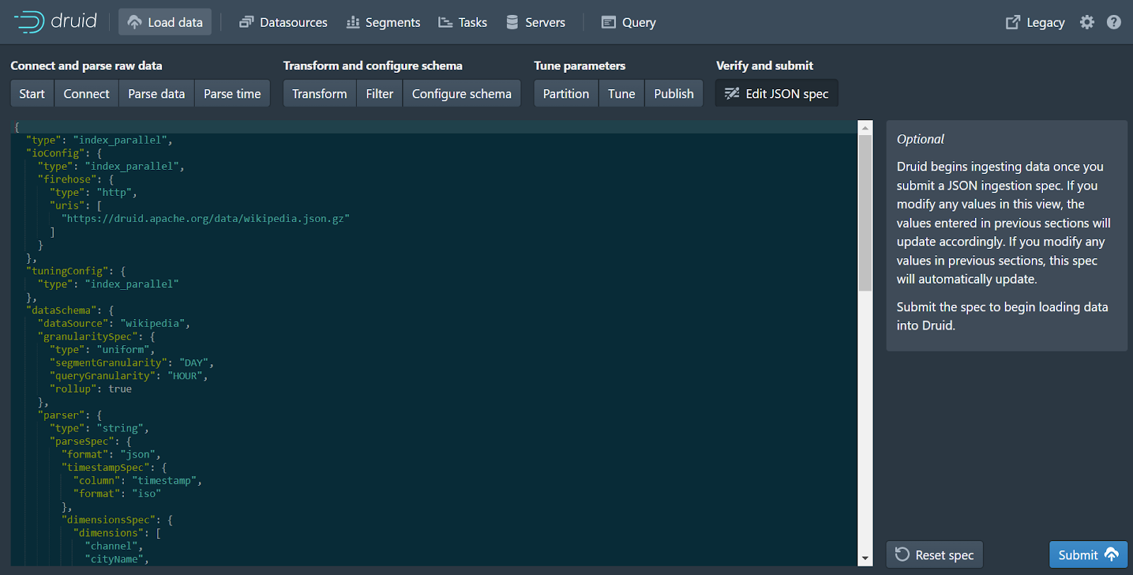 With the tutorial data, we’ll simply click through the ingestion workflow accepting the defaults, or click Edit JSON spec and then click Submit. If you wanted (or needed) to, you could look at the raw file as JSON and parse it. Druid creates its own time column called __time to organize and segment data. Because time is so important to Druid, it’s very good at figuring out how to handle timestamps regardless of their format. In addition, we can transform data, and optimize for query performance by partitioning data and sizing segments. Finally, you can tune the ingestion job in terms of threads and memory utilization, then schedule it and run it.