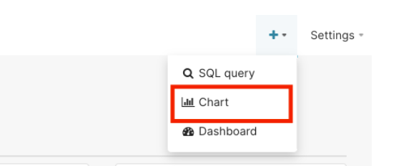 Return to the browser where you’ve logged into Superset, and once again click the “+” on the top right of the home screen. Then click Chart.