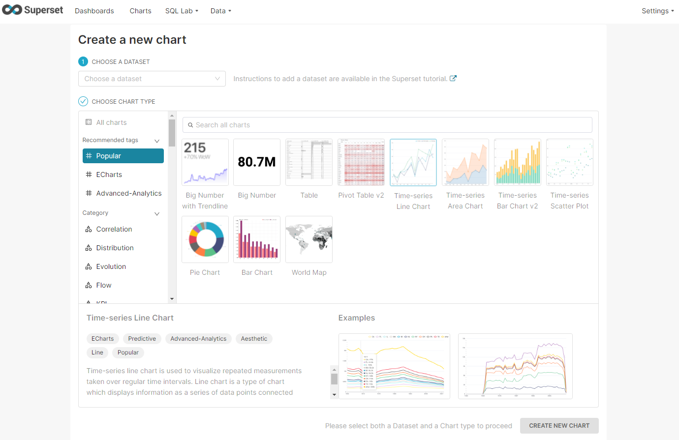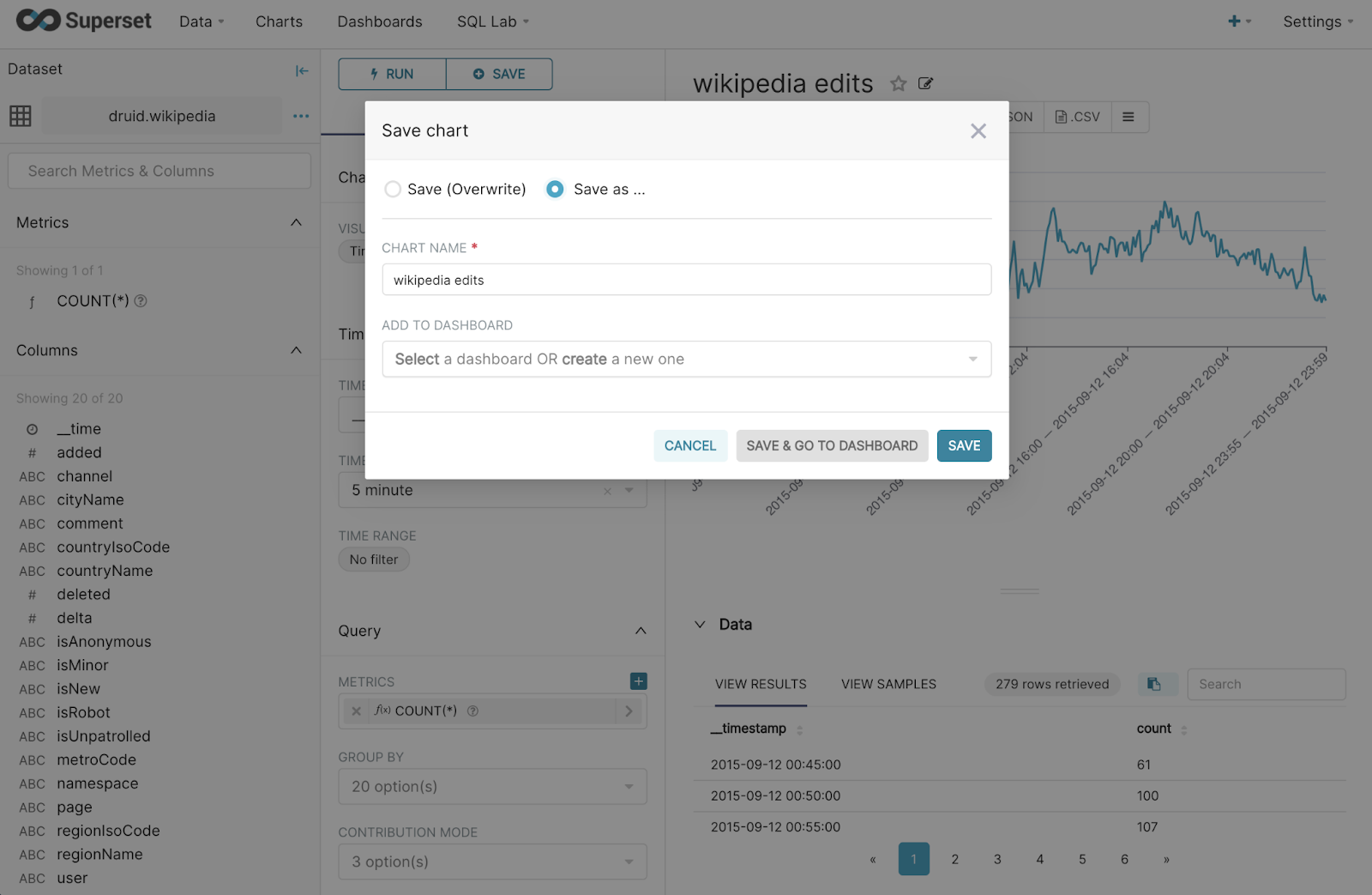 Select the dataset druid.wikipedia and then select a visualization. Superset includes a number of time-series visualizations. We’re going to choose Time-series Chart and then click New Chart.