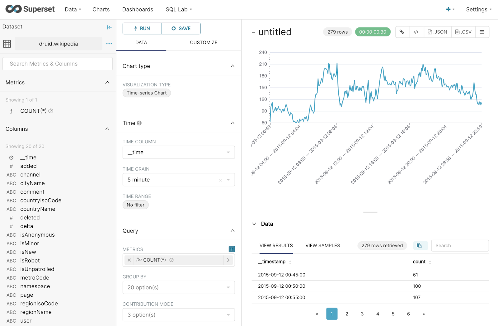 Initially, you won’t see any results, but don’t let that fool you. First, remove the Time Range by setting it to “no filter”. The Time Grain is set too high at “day”, so change that to “5 minute”. We’re now viewing a chart of the number of Wikipedia edits happening in 5 minute windows in our sample data.