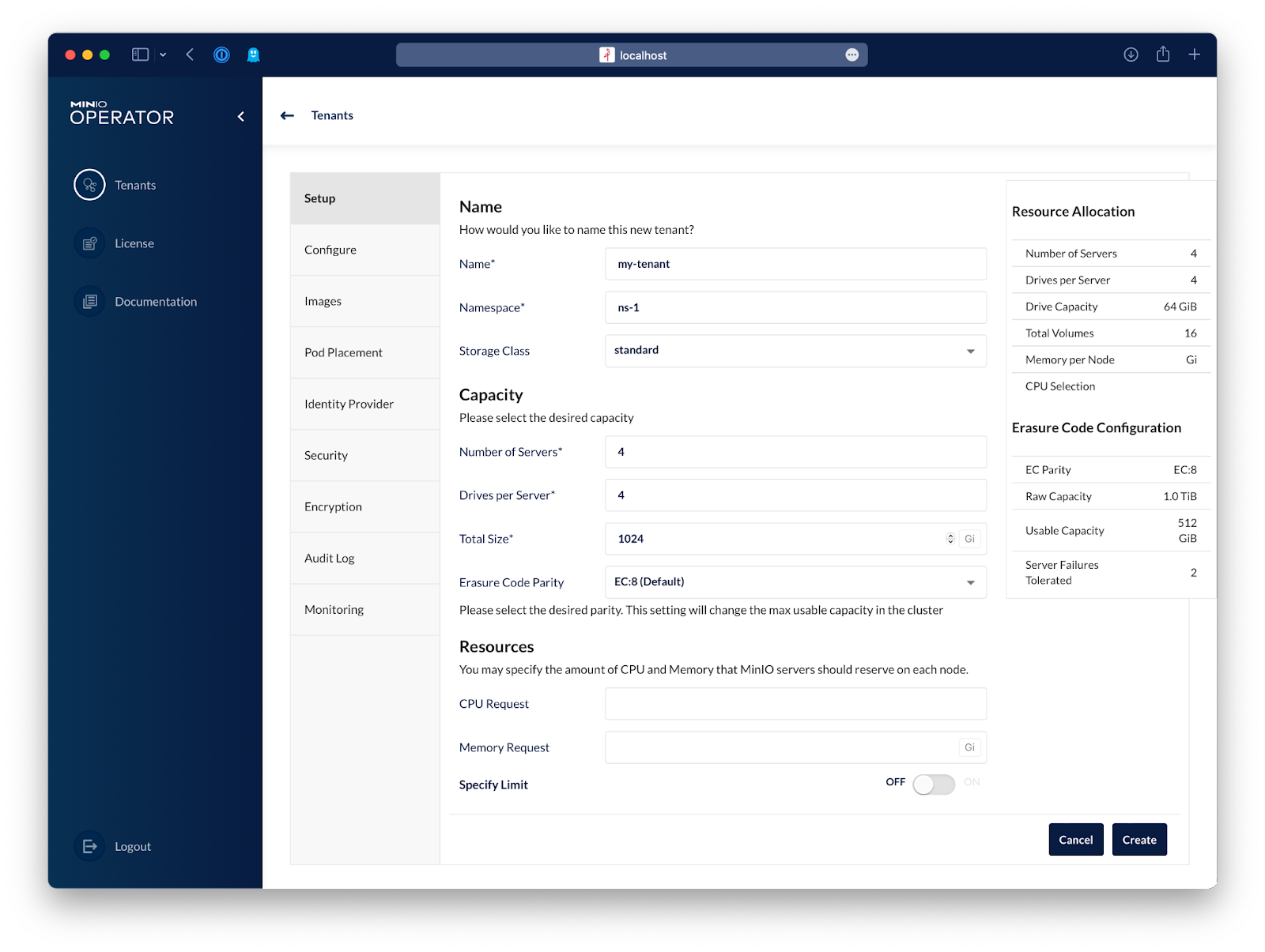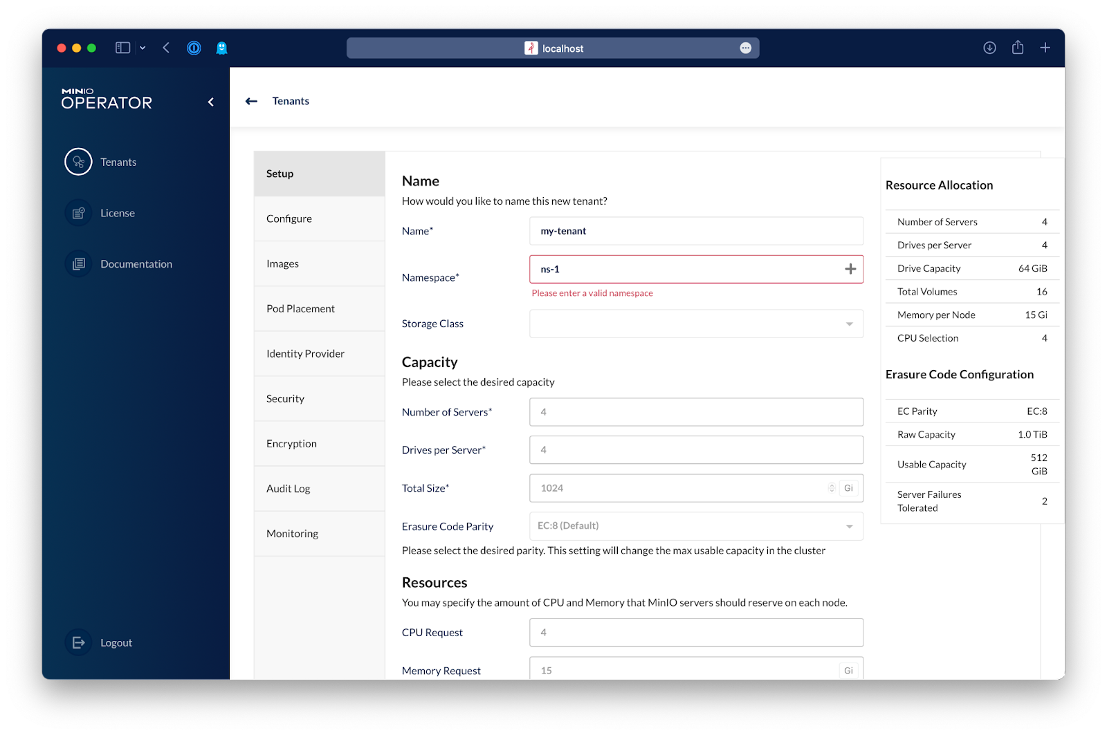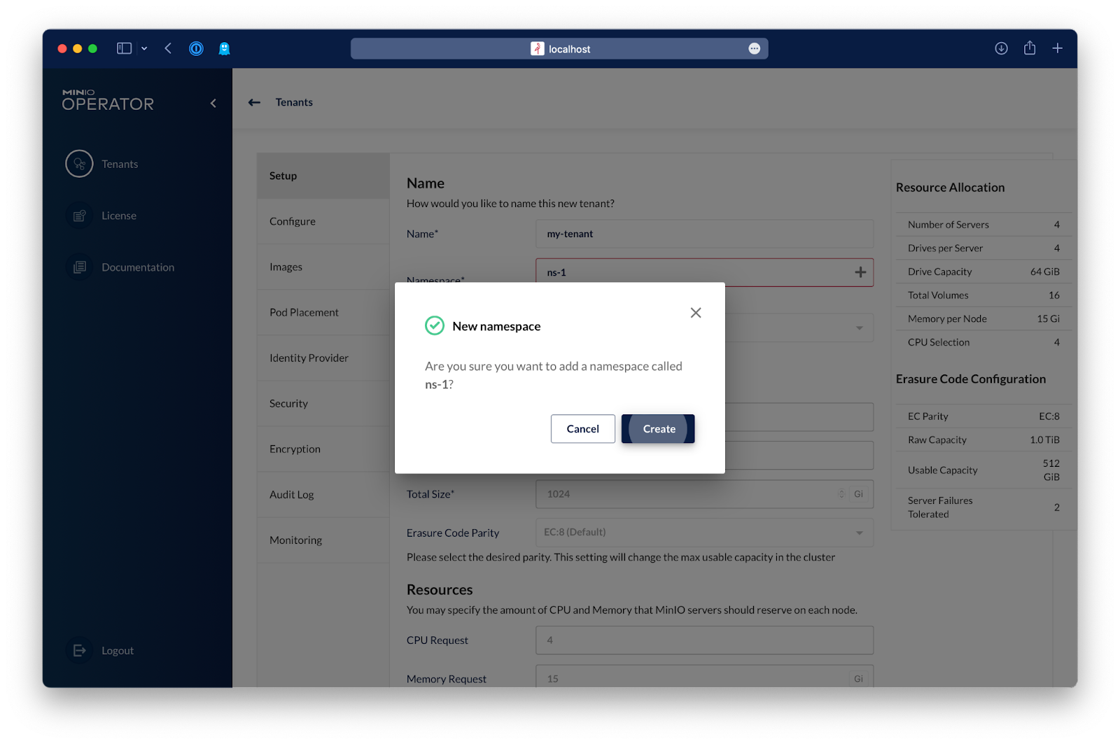 Enter the name of the new tenant and the namespace for it.