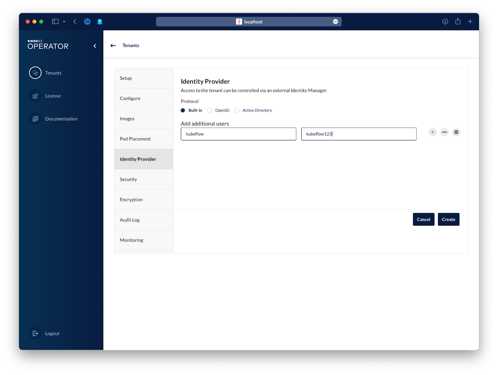 Let's go to Identity Provider and create a basic user that will be used by Kubeflow. If you choose to configure an external identity provider that uses OpenID or Active Directory/LDAP, you can just go ahead and create a service account after you log in to the tenant.