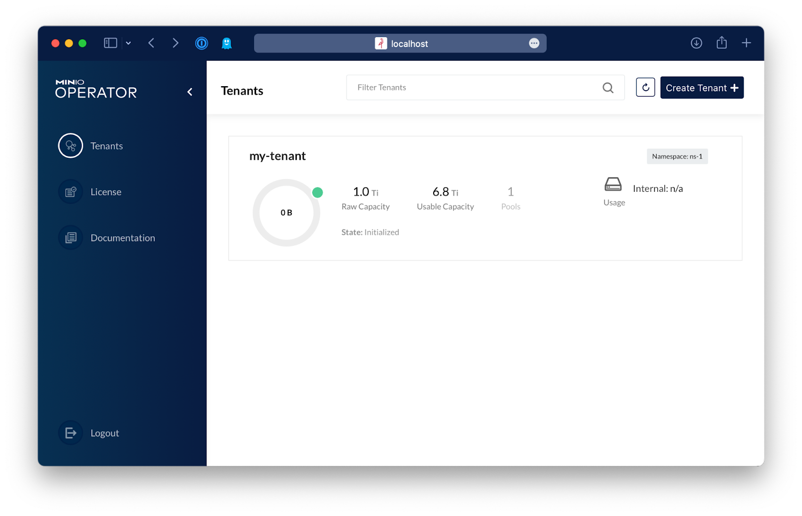 After logging in, click on Create Tenant and set up a 1TiB tenant.