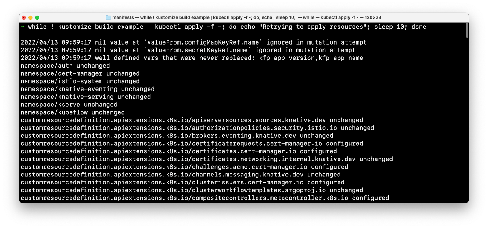 This command will take a few minutes to install all the resources needed by Kubeflow. If anything fails to apply, the command will continue attempting to apply it until it succeeds entirely.