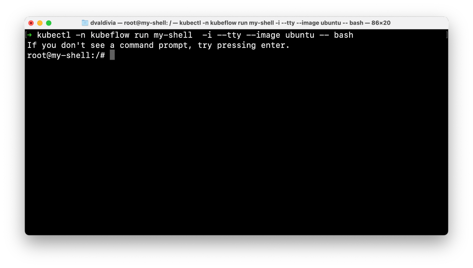 This shell runs on a pod running inside our Kubernetes cluster in the Kubeflow namespace.