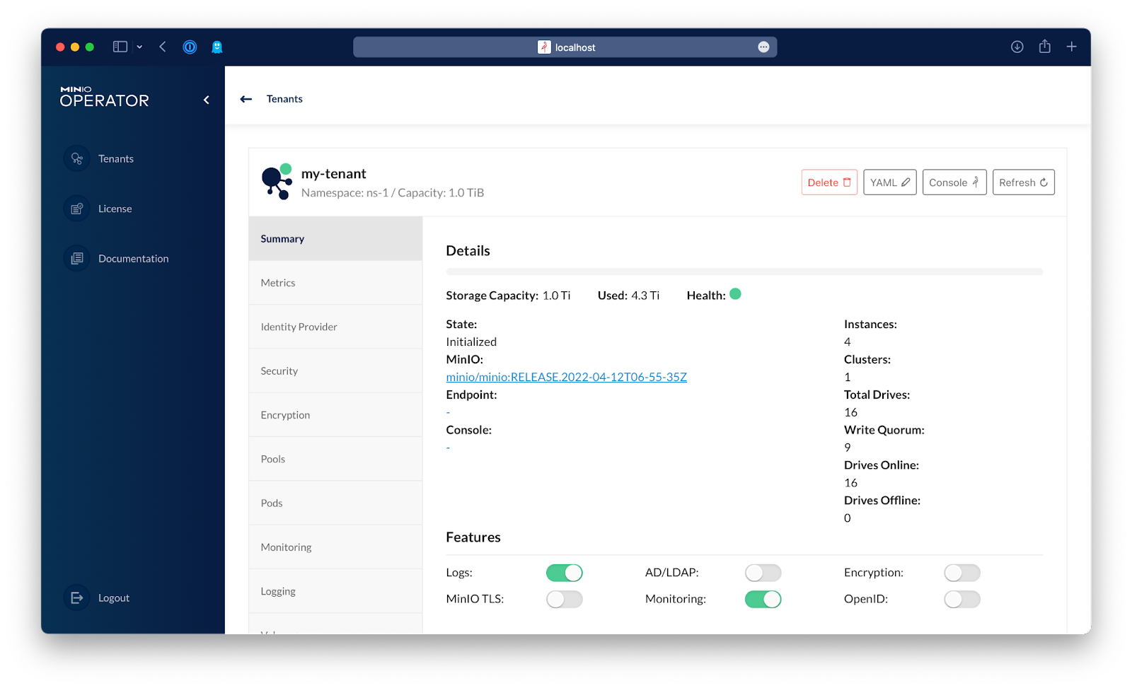 Click the tenant, and then click Console in the top right of the browser window to open MinIO Console in order to browse that tenant.