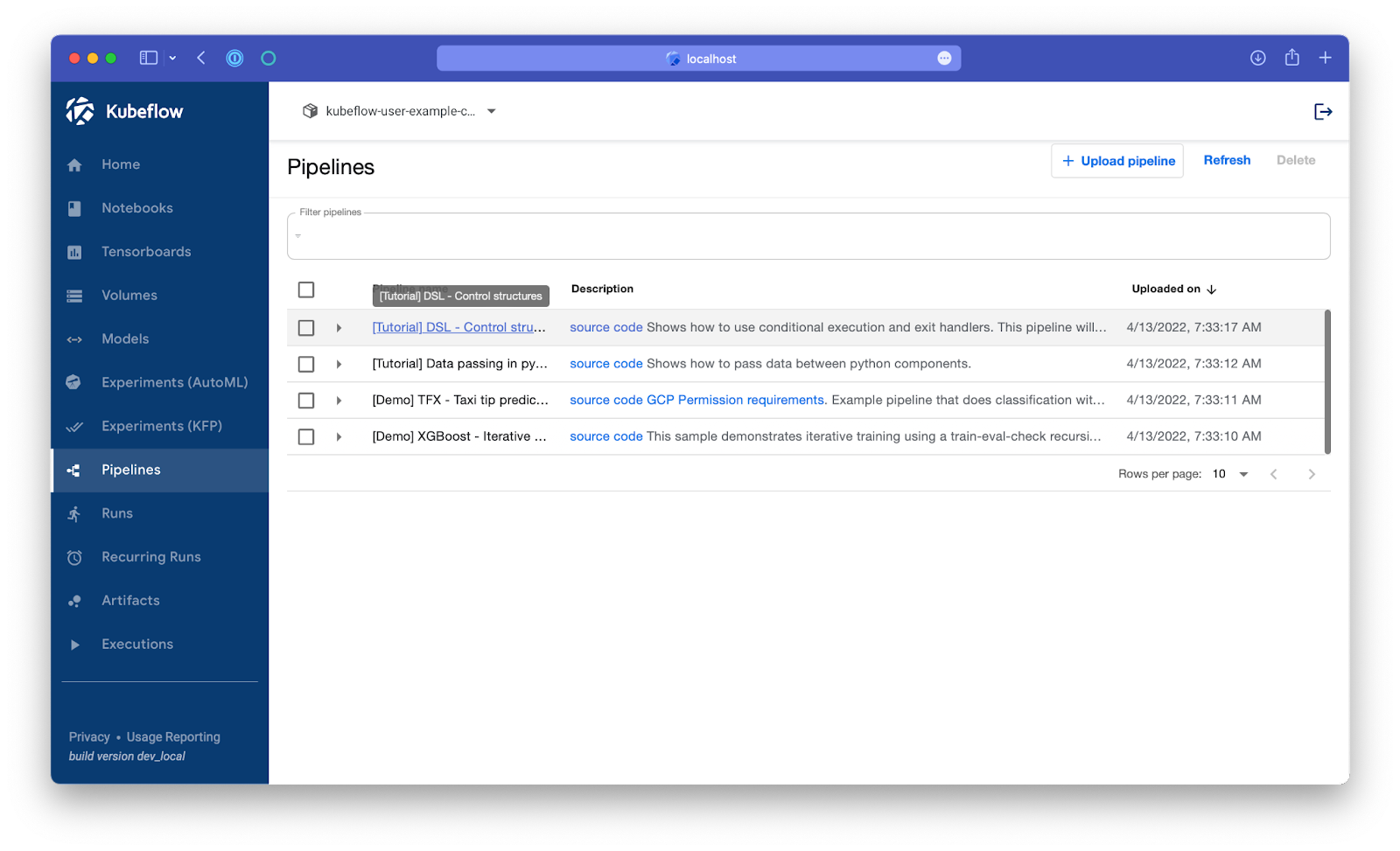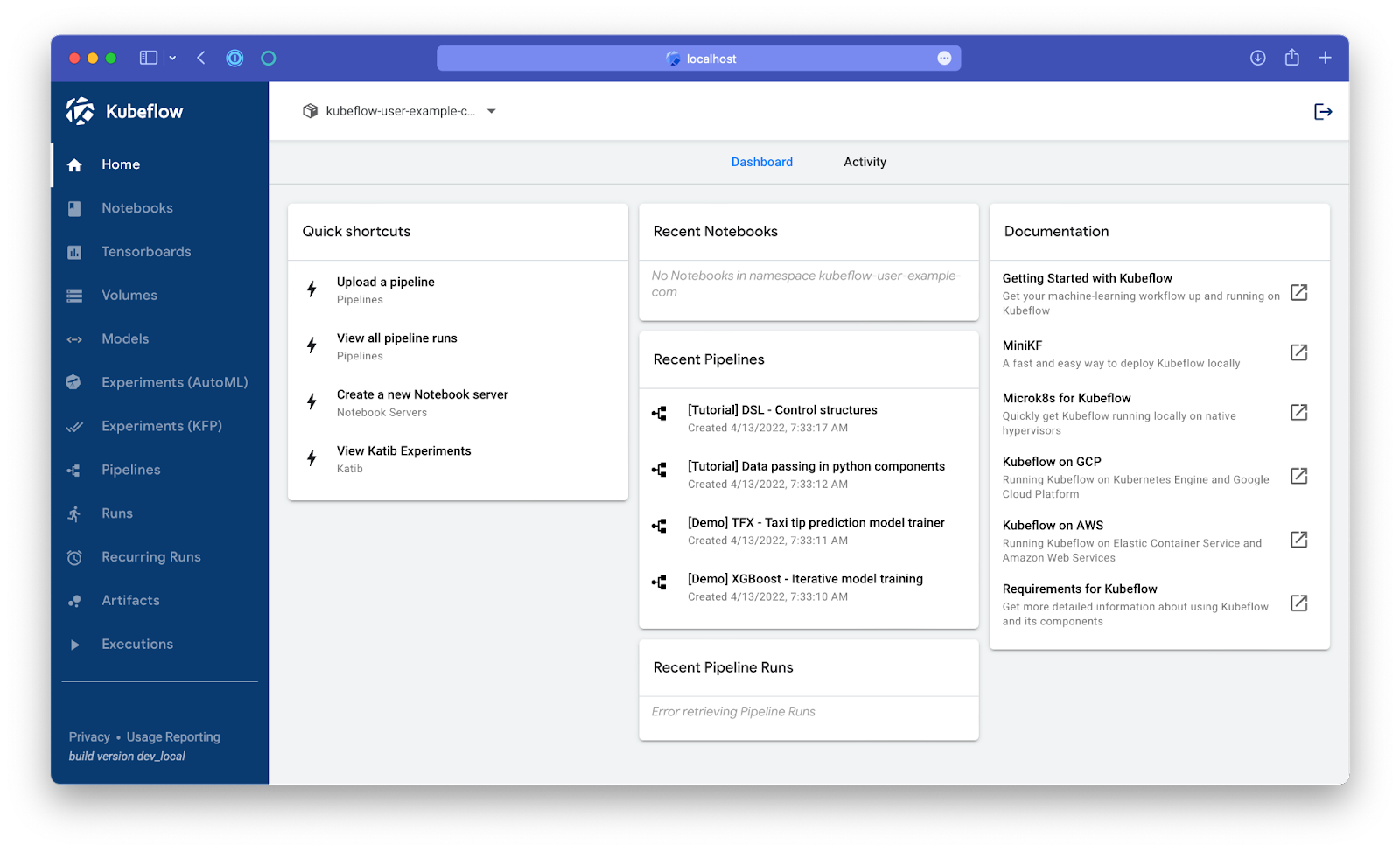 Now let's go into Kubeflow and run some pipelines, you can use port forwarding to expose the Kubeflow central dashboard:
