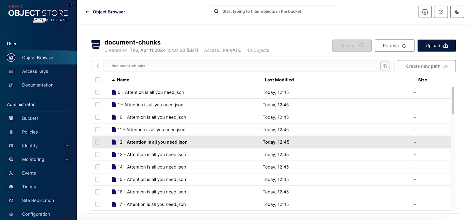 Once we have our document chunked up, the next step is to save each chunk to MinIO. For this, we will use the document-chunks bucket shown in the screenshot above. The function below will save a file to a MinIO bucket. We will use this function to save each chunk as a separate object.