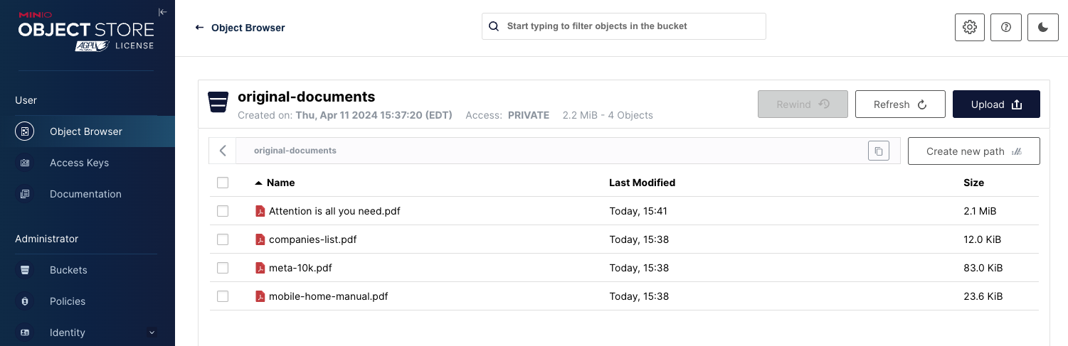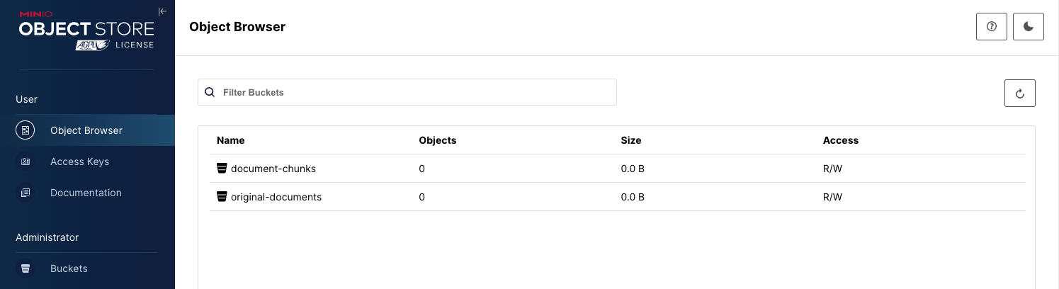 In a production environment, you will want to store both the original PDFs and the chunked objects in a storage solution capable of performance and scale. This is where MinIO comes in. The code in this section assumes you have two buckets set up, as shown below.