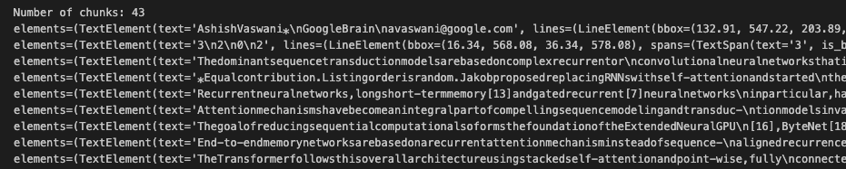Open-Parse provides a model_dump method for serializing the chunked document to a dictionary. The snippet below calls this method and prints some additional information to give you a sense of how this dictionary is formed.