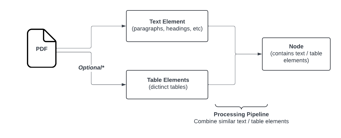 Open-Parse, an open-source library for splitting PDF files, goes beyond naive text splitting. It is designed to be flexible and easy to use. It chunks documents by analyzing layouts and creating chunks based on simple heuristics that keep related text in the same chunk. Below is a flow chart showing the Open-Parse logic. Note: Text nodes get transformed to markdown while table nodes are transformed into HTML.