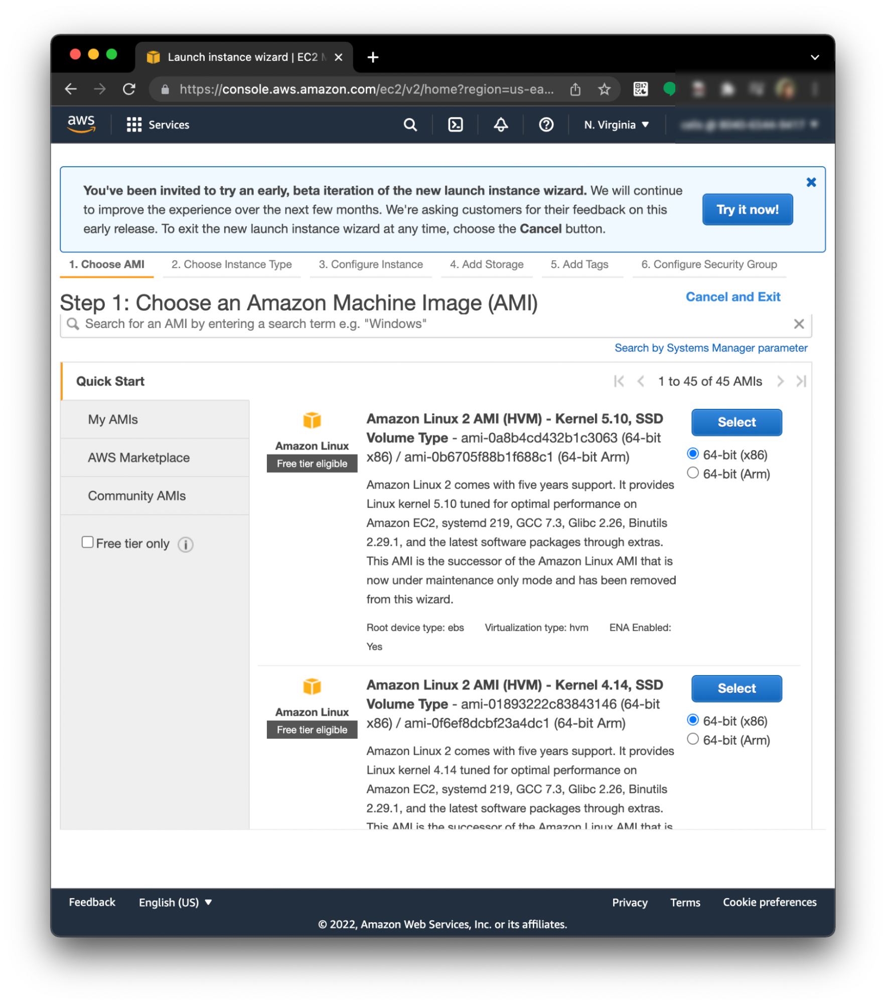 7. Choose the Amazon Machine Image also known as AMI. In this case we are going to be using Amazon Linux AMI from the top with x86 architecture.