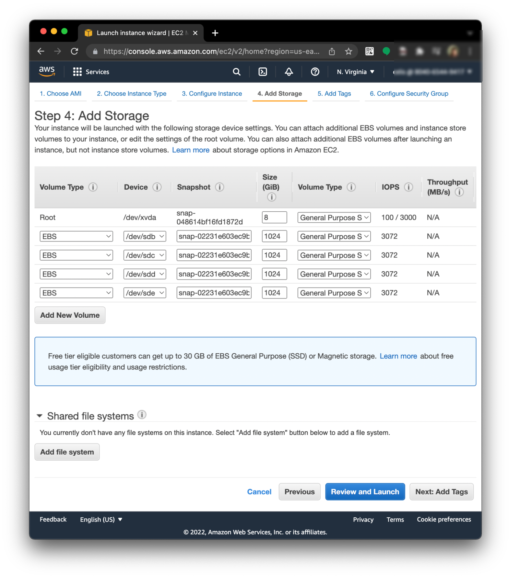 10. Once you’ve selected 4, click on “Next: Add Storage” and add 4 extra volumes to run MinIO in distributed mode. There are a few things to keep in mind. First of all, notice that because we are using EBS type storage, then it really does not matter which device letter you configure as long as it is mapped consecutively later on. The size is up to you and depends on your needs. Look for the best price-performance ratio and set your configuration. Please remember to delete or remove the disks once an instance is terminated so as not to incur extra cost.
