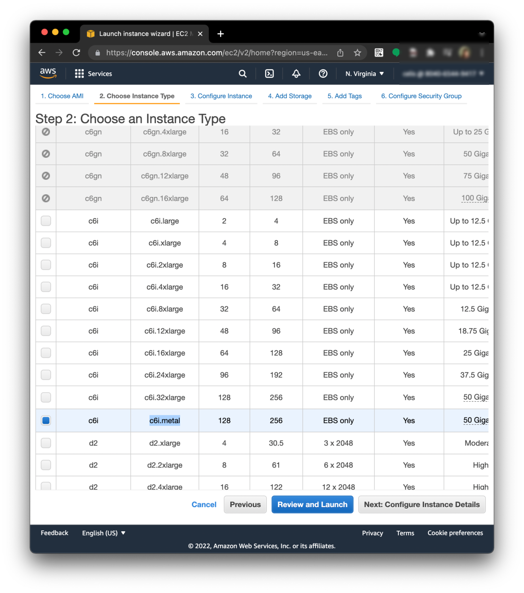 8. Then, select the Instance Type you want to test or use. Keep in mind that they can get very expensive as you increase HW capacity. You can use the AWS Calculator to estimate the price you will pay based on the time it will be used. For this example, we are going to use the c6i.metal Instance Type.