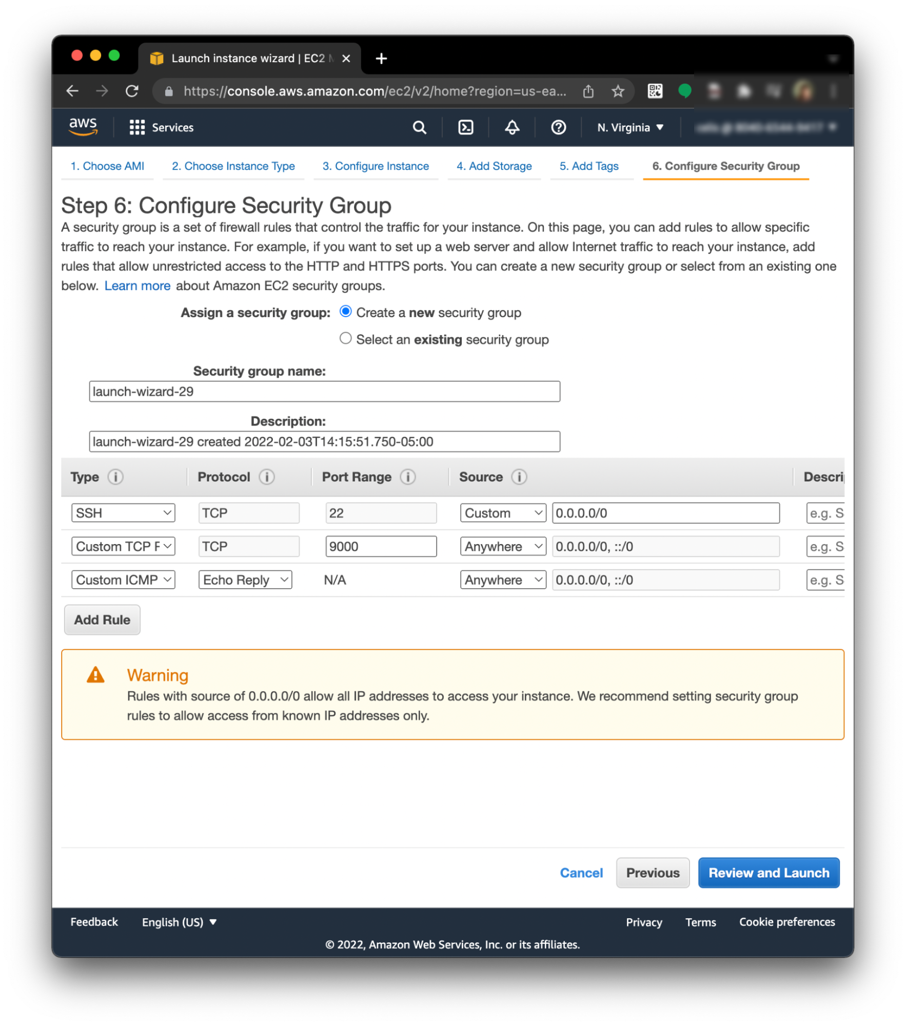 11. Next, let’s configure the Security group. This is important for you to connect via SSH and allow access to MinIO for management via port 9000 on TCP.