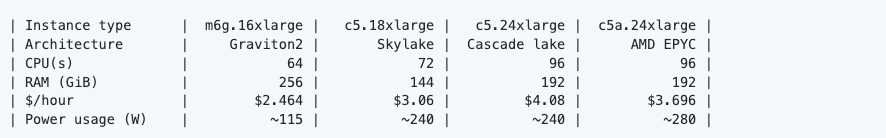Regarding power consumption it is estimated that the Graviton2 (running at 2.5 GHz) consumes up to 1.8 W per core, giving a total of about 115W. The AMD EPYC is rumored to take about 280W and the Intel's CPUs should consume roughly 240W. The following table sums up the information for each of the four CPUs: