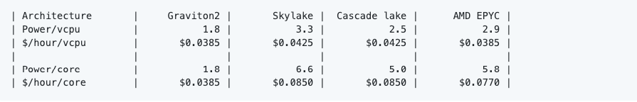 Perhaps unsurprisingly given ARM's background, in terms of power usage the Graviton2 is significantly more efficient compared against both the Intel CPUs and the AMD CPU. In terms of the cost comparison, the Graviton2 and AMD EPYC are priced identically on the "vcpu" basis with the Intel CPUs coming in a bit more expensive.