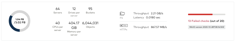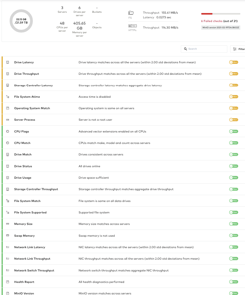 Our latest feature in SUBNET is SUBNET Health and it is all about automating maintainability. SUBNET Health provides a graphical user interface to key supportability components while automatically running dozens of checks on your MinIO instance to ensure it is running optimally.