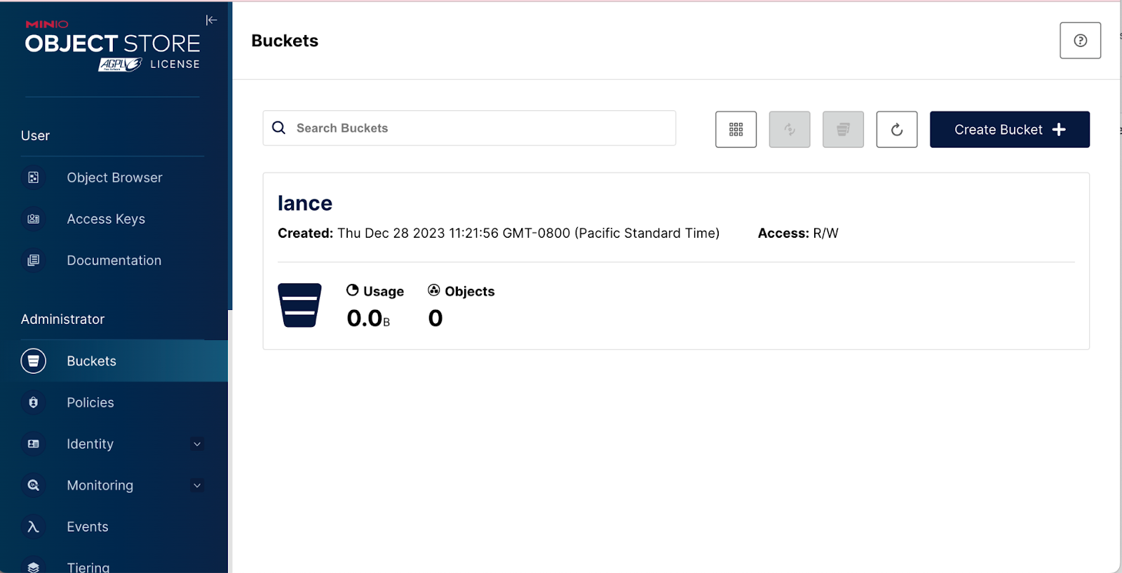 Next, run the following command to create a MinIO bucket called lance.