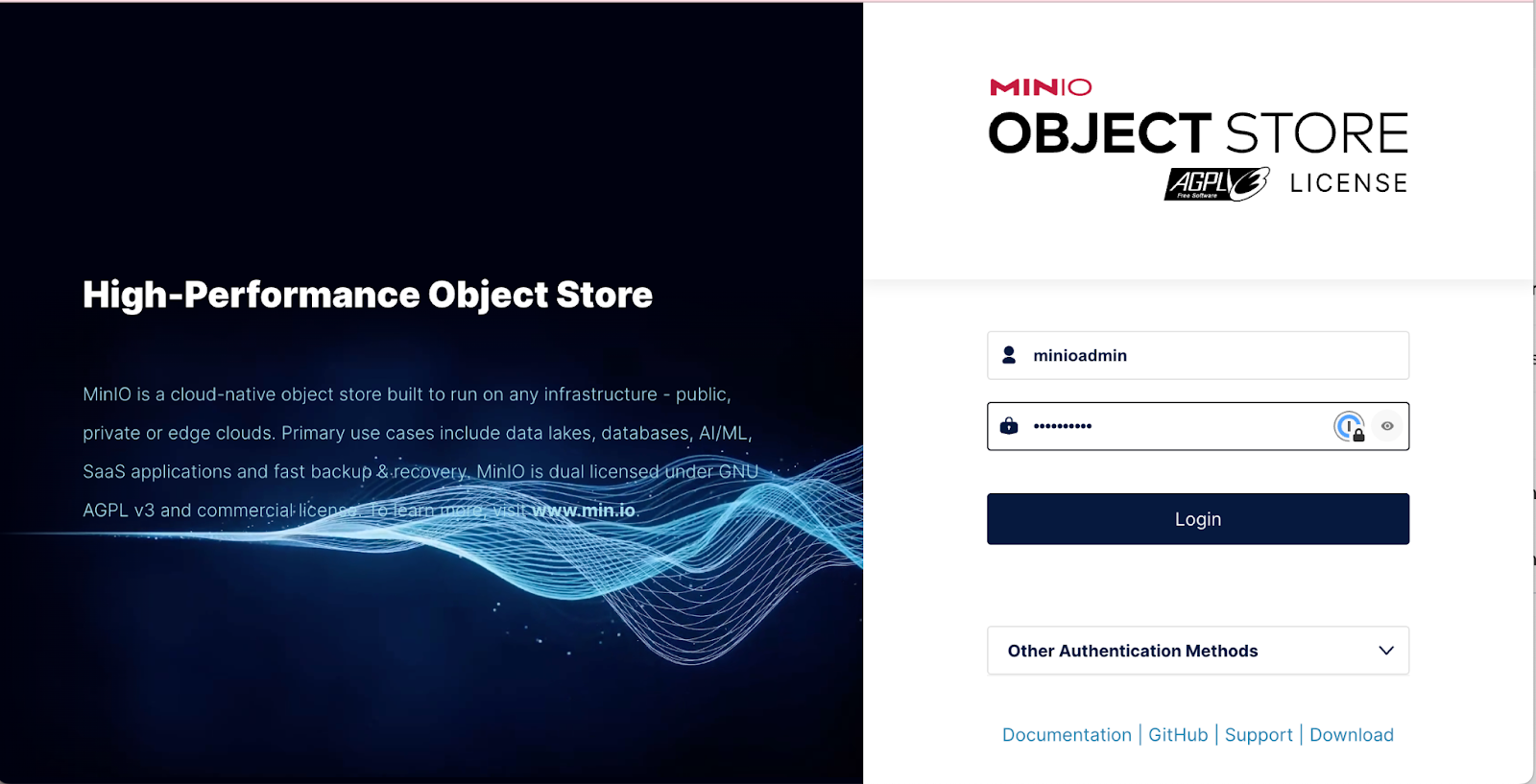 Log in with the username and password minioadmin:minioadmin.
