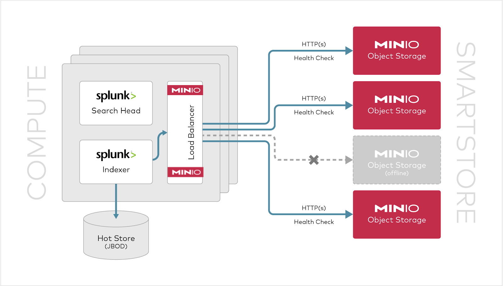 Splunk runs multiple indexers on a distributed set of nodes to spread the workloads. MinIO Firewall Load Balancer sits in between the Indexers and the MinIO cluster to provide the appropriate load balancing and failover capability. Because the Load Balancer is based on a shared-nothing architecture, each sidecar is deployed independently along the side of the Splunk indexer. As a result, Splunk now talks to the local MinIO Firewall Load Balancer process and the Firewall becomes the interface to MinIO. These indexers talk to the object storage server via HTTP RESTful AWS S3 API.
