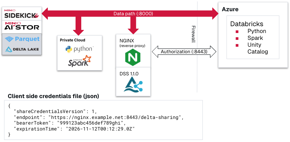 The architecture places the reference Delta Sharing Server in a private cloud environment, secured behind an NGINX reverse proxy. The control plane manages authentication and authorization over HTTPS using bearer tokens, while the data plane provides direct access to data stored in AIStor.