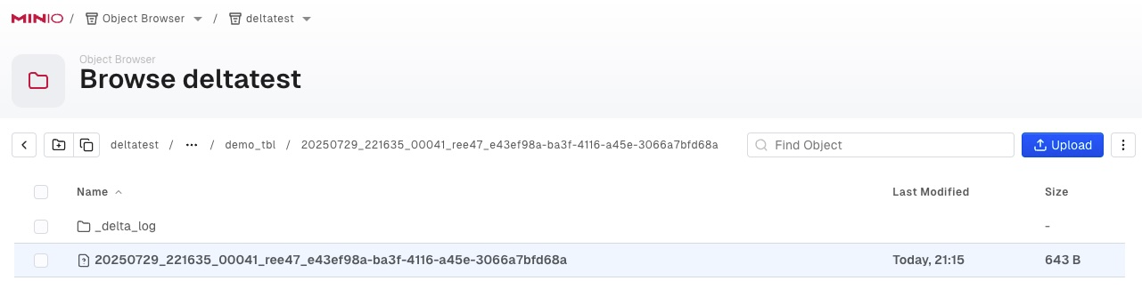 The Delta Tables retrieved from AIStor object storage are located in the bucket path deltatest/demodata/demo_tbl which is the location called out in the Delta Share configuration.