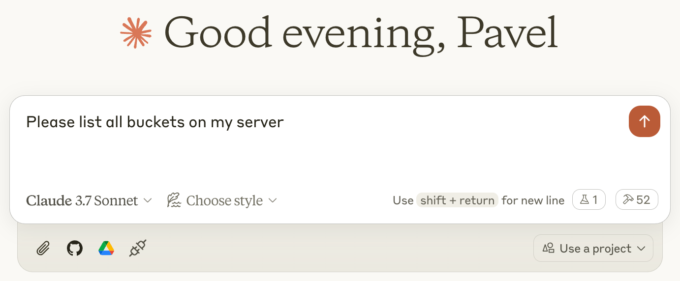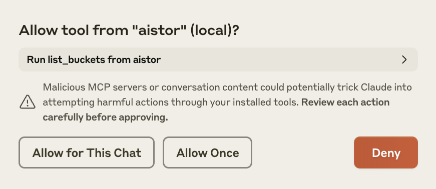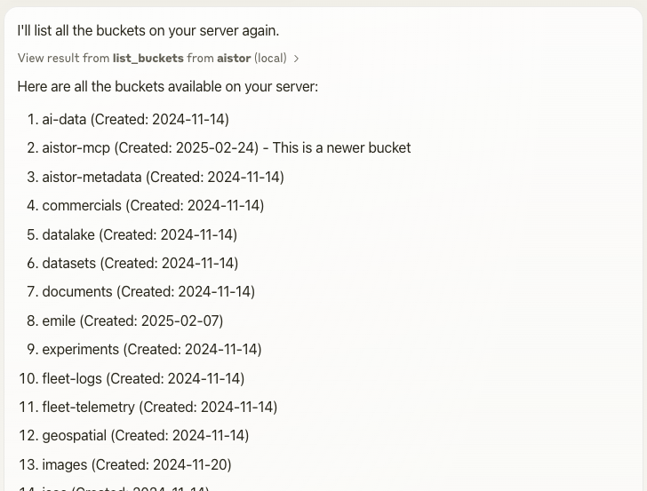 Let’s see how easy it is to explore data in an AIStor object store using MCP. In the following screenshots and dialogues, I’ll show you some operations with the AIStor object store using Anthropic Claude for Desktop client. Plenty of other MCP clients are available, and you can configure all of them to use the AIStor MCP server.