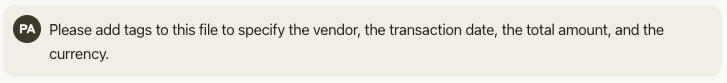 To make future analysis faster and more effective, it would be great to add tags to each object, such as vendor, transaction date, amount, and currency. Let’s try it.
