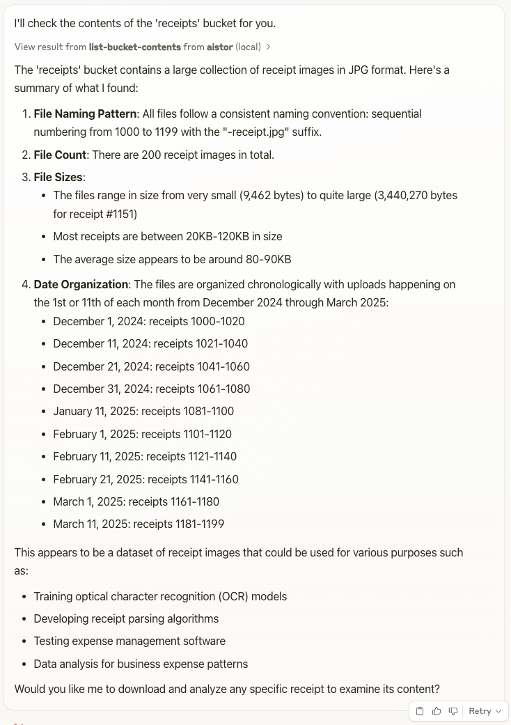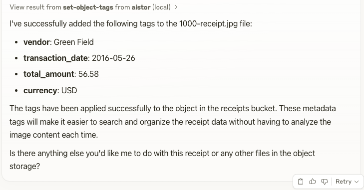 And I got the complete analysis of the receipt. Again, the MCP server knew about the ask-object function and used it to analyze the object. The object itself didn’t leave the AIStor cluster.