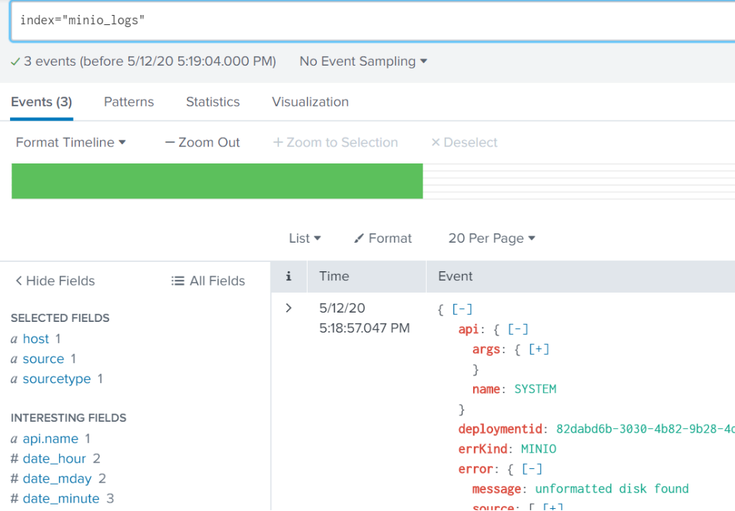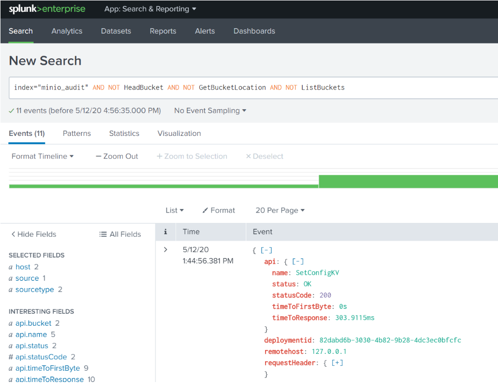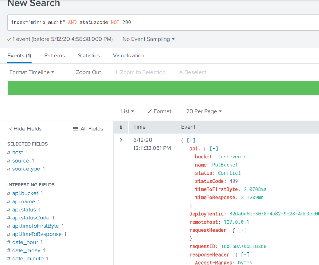 Note the “Success” status at the end. Now we can see the event by searching for index="minio_audit".