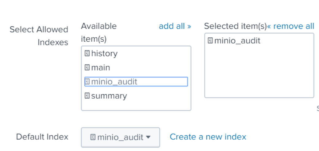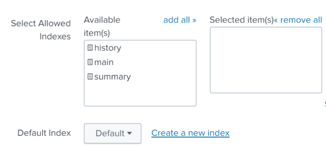 Change default index to the index you just named, and make sure it appears in the “Selected items” box on the right hand side to make sure your events go to the newly created index.
