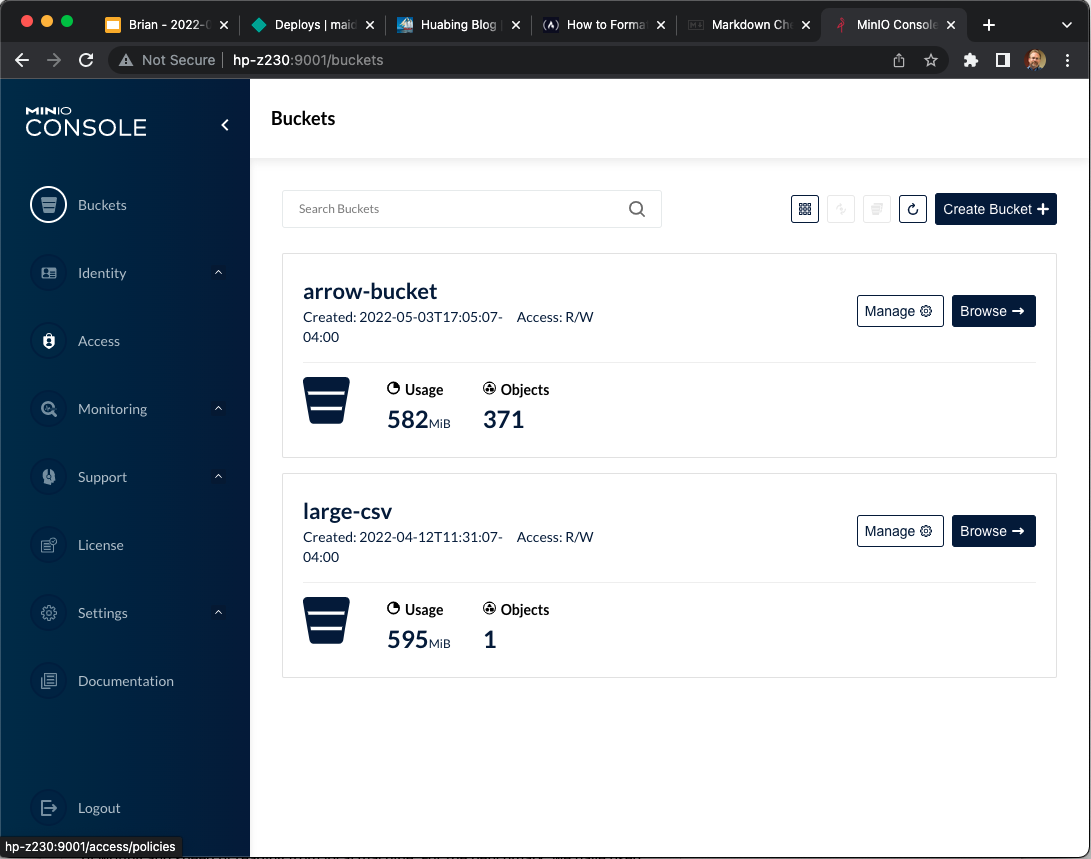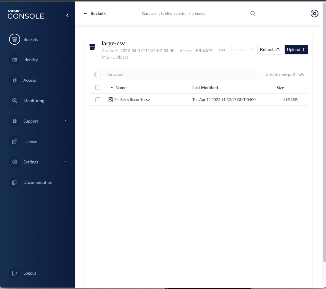 I started by downloading the sales data to a local directory on my machine, and copying it to a bucket on MinIO. Copying the file to MinIO can be accomplished using the MinIO command line tool mc, or uploading the file from within the MinIO console. I created a bucket called large-csv and uploaded the 5m Sales Records.csv file to it from within the console. This is the starting point for the work we will do.