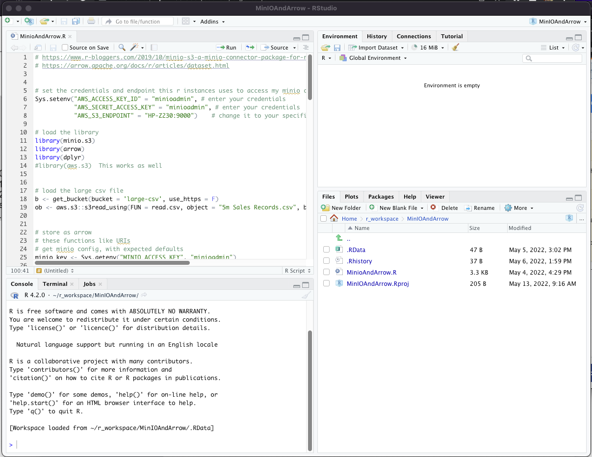 The R language has a companion IDE called RStudio, which I will use for this development. If you want to follow along please install R and RStudio, and have access to a MinIO cluster. If you aren’t already running MinIO and mc, the MinIO client, please download and install them.