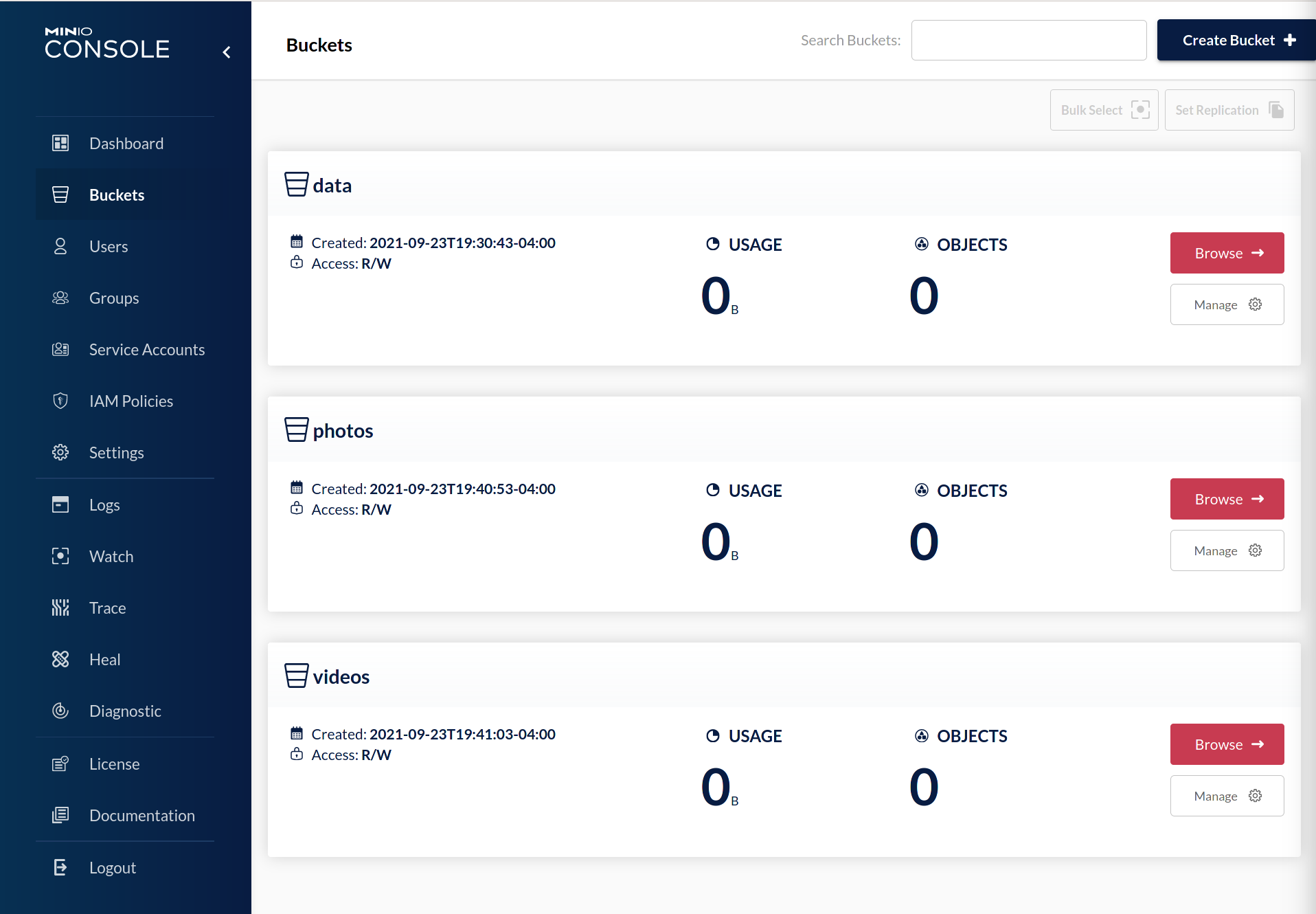 Once I have all my buckets ready, I'm going to bulk configure replication for all three buckets.