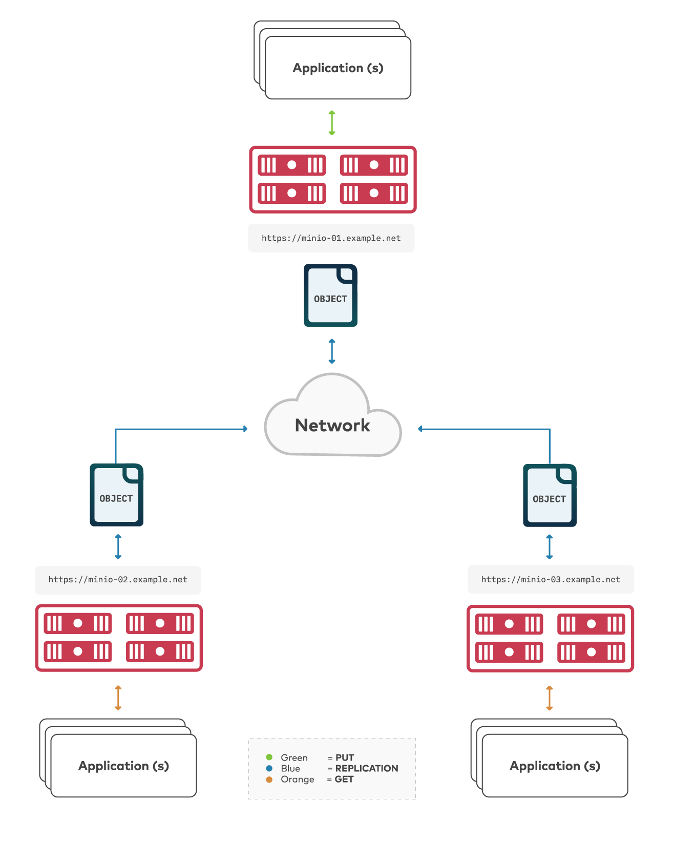 Latency: Multi-site replication has increased latency sensitivity, as MinIO does not consider an object as replicated until it has synchronized to all configured remote targets. Replication latency is therefore dictated by the slowest link in the replication mesh.