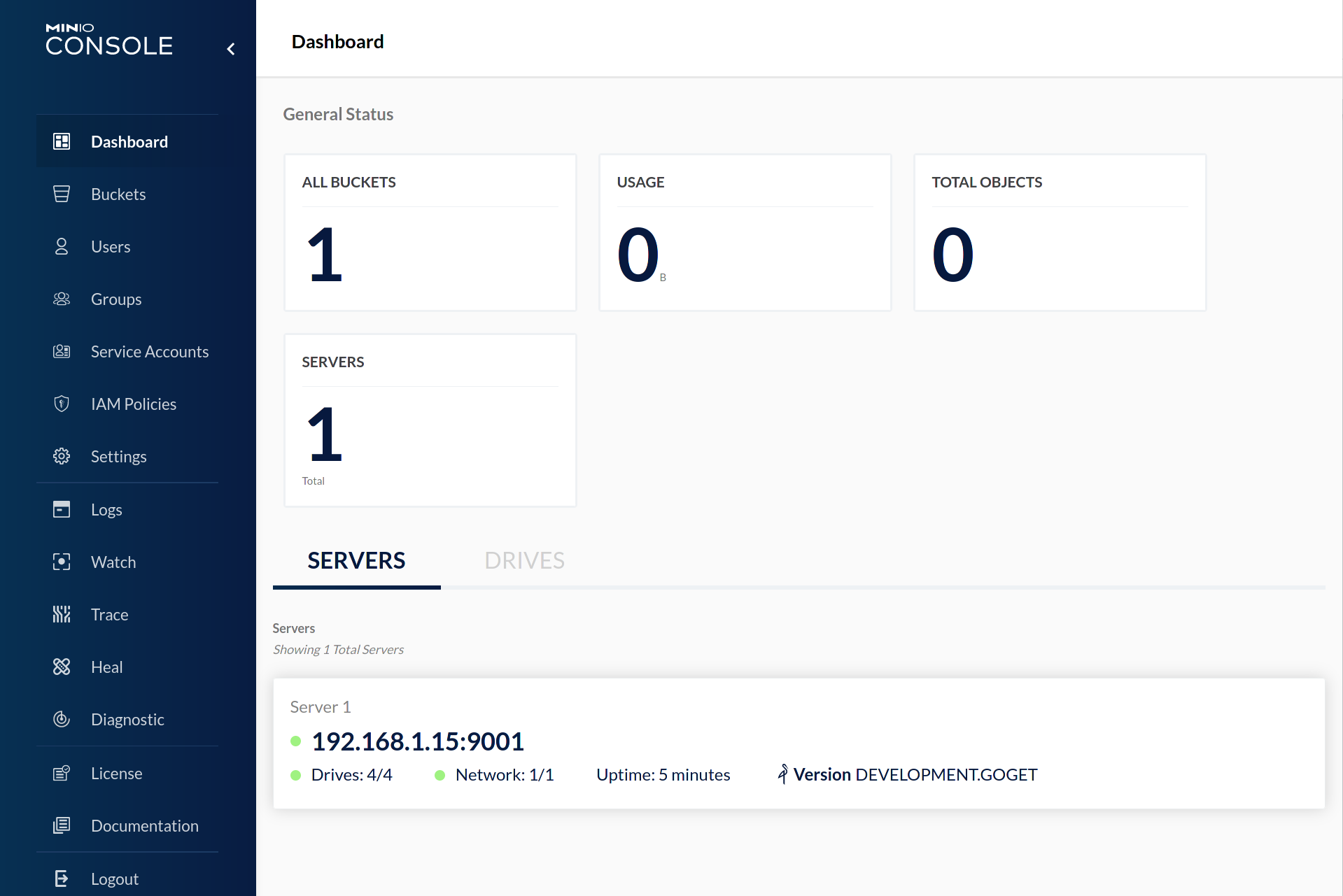 We're going to use the MinIO Console to make things easier, although this can also be done with ‘mc’ from the command line. You can start by logging into the Console from your web browser - just enter in the IP address or hostname for any one of the MinIO Deployments. I'm running a distributed MinIO deployment (1 node, 4 drives) locally on port 9001, so I'm just going to browse to http://localhost:9001.