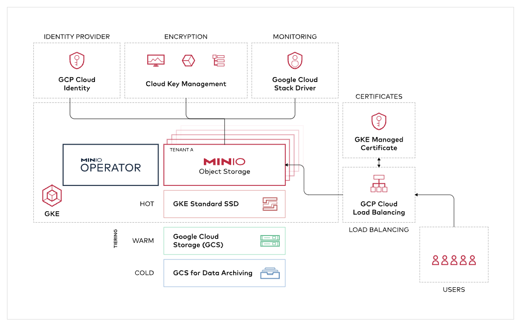 The second way to deploy MinIO is through a “roll your own” approach. There are more than 150,000 of these deployments running today on GCP. One way to make the “roll your own” even easier is to leverage the MinIO Operator. The MinIO Operator works seamlessly with any flavor of Kubernetes to provision MinIO on top of GCP infrastructure.