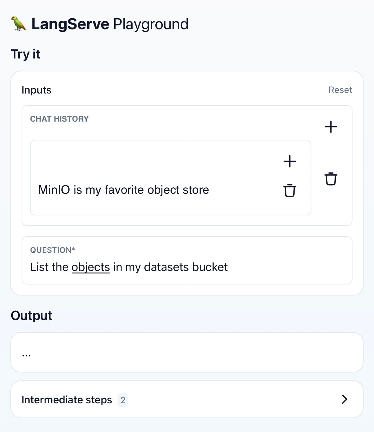 Consequently, our MinIO-integrated LangChain agent is now adeptly transformed into a deployable API, ready to be developed and extended for users with functionalities ranging from batch processing to real-time interactions.
