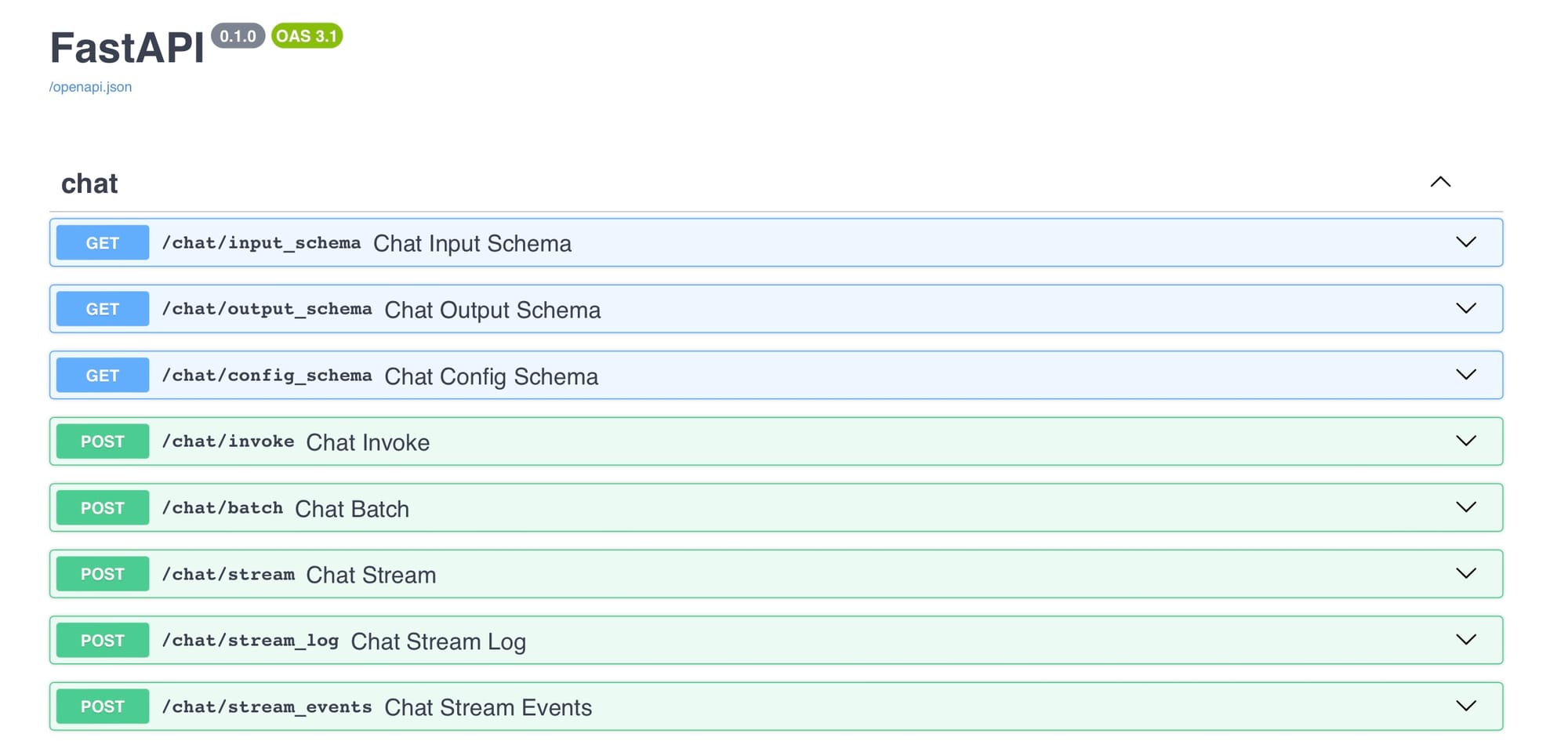 In the python output the LangServe logs identify /invoke/playground as the application endpoint. We can now visit the playground WebUI as well as the automated documentation for our API that’s available by visiting the /docs path of our API; giving us a simplified approach to testing and configuring by including Try it out button for each of our applications features, as well as predefined cURL requests that we can execute from the WebUI.