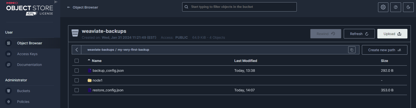 weaviate-backups bucketBy the end of this demonstration you will be able to see the bucket objects that Weaviate creates throughout the process when utilizing the backup-s3 module.