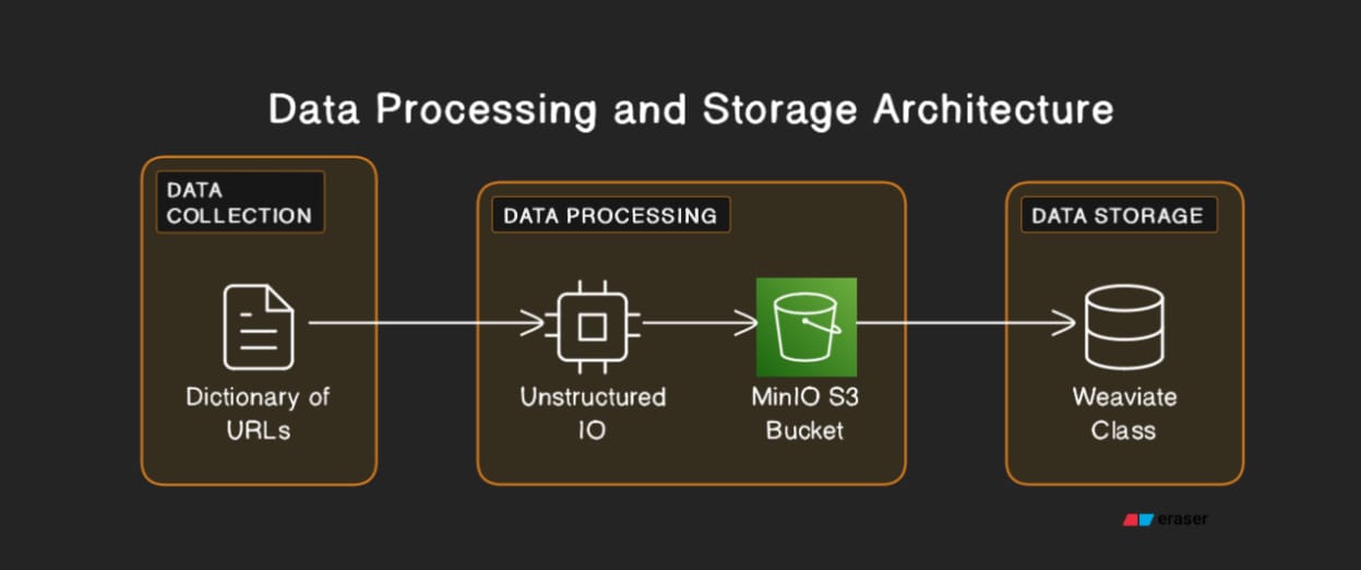 This structured approach not only streamlines the ingestion of web data into our system but also lays the groundwork for subsequent stages, where this data will be stored in MinIO and indexed in Weaviate. By carefully selecting URLs as data sources, the process ensures a rich, varied dataset is available for exploration, ready to drive insights and decision-making in a wide array of contexts.